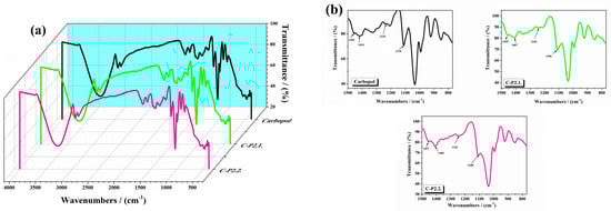 The FTIR spectra of the studied hydrogels (a) between 4000 and 500 cm−1 and (b) between 1500 and 770 cm−1.