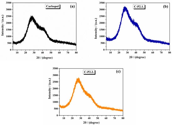 The XRD diffraction spectra of the 1% Carbopol gel, C-P2.1, and C-P2.2 are shown in Figure 2. The 1% Carbopol gel has an amorphous pattern with a broad peak around 20°, indicating the amorphous nature of Carbopol (Figure 2a). This feature reflects the lack of long-range order in the cross-linked polyacrylic acid structure, consistent with literature reports for Carbopol polymers []. C-P2.1 (Figure 2b) and C-P2.2 (Figure 2c) show slight changes in their peak patterns at specific 2θ values, but the changes are not significant.