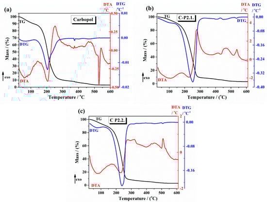 The thermal curves of the 1% Carbopol gel and Carbopol integrated with porphyrins gels are presented in Figure 3 ((a) 1% Carbopol gel, (b) C-P2.1, and (c) C-P2.2). The TG curve of the 1% Carbopol gel presents the following thermal steps. First, an initial weight loss below 150 °C due to the loss of adsorbed water, associated with an endothermal effect on the DTA curve. Second, Figure 3a shows, on its thermal curve, a major weight loss starting around 150 °C and corresponding to the thermal degradation of the Carbopol polymer backbone []. The thermal curves of C-P2.1 (Figure 3b) present a major two-step weight loss in two stages: the first step starting around 180 °C and the second step around 310 °C, associated with exothermal effects on TGA curves. C-P2.2 (Figure 3c) also shows a two-step weight loss pattern starting at 190 °C. TGA studies in the literature often show a major weight loss for Carbopol starting around 200–230 °C, caused by the combustion of organic components, with variations due to the presence of incorporated drugs or additives []. The thermal analysis results are consistent with these reports, indicating that the incorporation of porphyrin derivatives not only interacts with the Carbopol matrix, but also enhances its thermal stability.