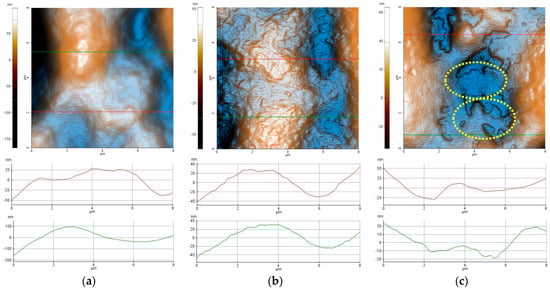 Enhanced-color 2D AFM topographic images of the 1% Carbopol (a), C-P2.1 (b), and C-P2.2 (c) samples recorded at the scale of 8 µm × 8 µm. Below each AFM image, two characteristic surface profiles (red and green scan lines) are exemplified.