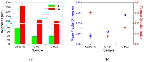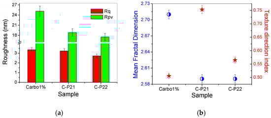 (a) Corrugation parameters: RMS roughness (Rq) and peak-to-valley index (Rpv); (b) mean fractal dimension (MFD) and textural direction index (Stdi) for the hydrogels based on Carbopol (1% Carbopol, C-P2.1, and C-P2.2) at the scale of 2 µm × 2 µm.