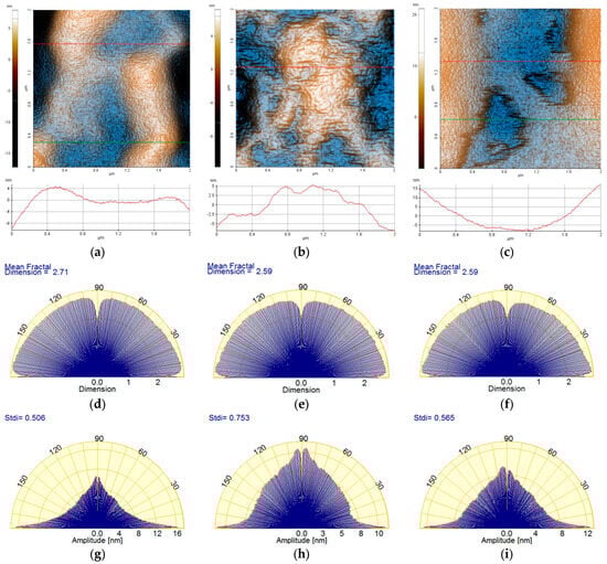 Enhanced-color 2D AFM topographic images of the 1% Carbopol (a), C-P2.1 (b), and C-P2.2 (c) samples at the scale of 2 µm × 2 µm; below each AFM image, the characteristic profiles (scan lines) are exemplified. Angular Fourier spectra of the mean fractal dimension (MFD) (d–f) and textural direction index (Stdi) (g–i) were plotted for the AFM images of the 1% Carbopol, C-P2.1, and C-P2.2 samples at the scale of 2 µm × 2 µm.