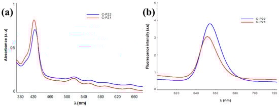 The values of the spectral parameters associated with the absorption and fluorescence maxima of the gel–porphyrin samples investigated are presented in Table 2. In Figure 8, the emission spectra of P2.1 and P2.2 in the 1% Carbopol matrix are shown as an example.
