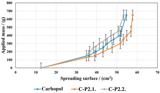 P2.1 induces an increase in the spreading ability compared to the Carbopol base gel, and P2.2 a decrease. However, the two porphyrins do not lead to significant changes in the gel structure; the values of the spreading areas within the three series are close to each other. In all the gels tested, the spreading area increases with the increase in the mass applied, indicating a good spreading performance on the skin, resulting in easy and uniform application.