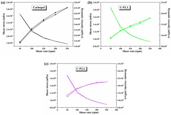 Variation in dynamic viscosity and shear stress as a function of shear rates in (a) Carbopol, (b) C-P2.1, and (c) C-P2.2.