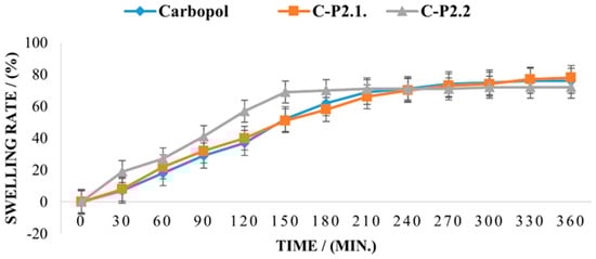 The swelling capacity for the 1% Carbopol gel exceeds 80% after 360 min, and the effect of P2.1 on the swelling behavior of the matrix is insignificant, indicating that the moisture absorption performance is polymer-controlled and no new interparticle bonds are formed in C-P2.1. In contrast, the swelling behavior of C-P2.2. is different, with a higher swelling capacity in the first 150 min; then, a plateau is reached, and no further moisture can be absorbed. The swelling behavior of a dry hydrogel is mostly dependent on its composition and structure and also affects its mucoadhesive properties. When the hydration degree increases, mucoadhesion becomes more cohesive, up to a point, then loosening at the polymer–tissue interface and leading to excessive hydration, which causes an abrupt drop in mucoadhesion [,]. It has been demonstrated that the addition of compounds with a high proportion of carboxylic acid or hydroxy groups in the carbomer matrix is the cause of the rise in moisture content [] and that, conversely, the compactness of the film network can be the cause of the decrease in moisture content when this occurs [].