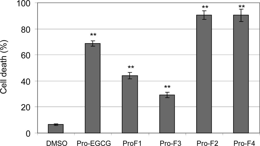 Peracetate-protected F-EGCG analogs induce cell death in human leukemia cells. Jurkat T cells were treated with 50 μM of Pro-F-EGCG1 to Pro-F-EGCG4 (indicated by Pro-F1 to Pro-F4, respectively) for 24 h, Pro-EGCG (1) and DMSO used as controls, followed by Trypan blue dye exclusion assay. The data represented are the mean number of dead cells over total cell population. ** P < 0.01, Bars, SD, mean of three experiments.