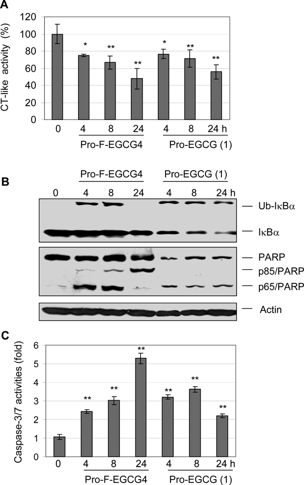 Treatment of Pro-EGCG (1) also caused a decrease in the level of the proteasomal CT-like activity in a time-dependent manner (Fig. 3A) and induced the increased level of the ubiquitinated form of IκB-α at all the time points (Fig. 3B). Treatment of Pro-EGCG (1) also resulted in caspase activation (increase of 2–3.5 folds) (Fig. 3C) and calpain activation, as shown by the appearance of p65 PARP fragment (Fig. 3B). We noticed that the slightly increased caspase activity was not associated production of p85 PARP (Fig. 3B), suggesting that activation of calpain is predominant (which cleaves PARP into p65 fragment, Fig. 3B) under the experimental conditions. However, under each condition, Pro-F-EGCG4 showed greater potency than Pro-EGCG (1) (Fig. 3).