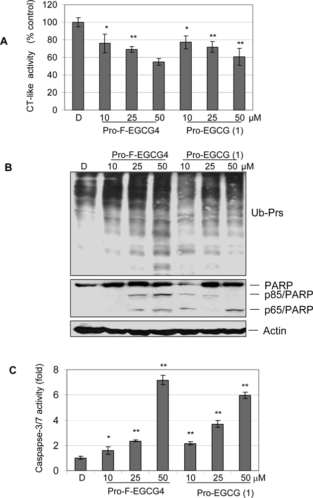 The proteasome-inhibitory and apoptosis-inducing effects of Pro-F-EGCG4 and Pro-EGCG (1) in dose-dependent manner. Jurkat T cells were treated with indicated concentrations of Pro-F-EGCG4 and Pro-EGCG (1) for 24 hours, DMSO (D) as solvent control, followed by preparation of cell extracts for measuring the chymotrypsin-like activity (A), Western blots analysis (B) and caspase-3/7 activities. * P < 0.05, ** P < 0.01, Bars, SD, mean of three experiments.
