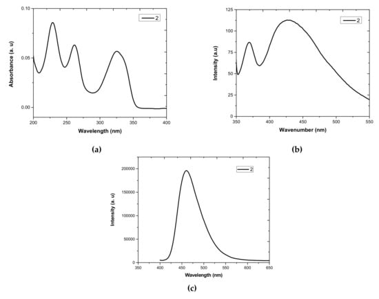 The optical properties of the target molecule 2 were determined at room temperature, with a set concentration of 2 µM solution in acetonitrile (Figure 1). The title compound displayed three major absorption bands at 229, 262 and 326 nm. The fluorescence spectra exhibited dual emissions at 369 nm (i.e., weak sub-band) and 429 nm (i.e., strong main band) in acetonitrile solvent at 2 µM concentration due to phototautomerization [] (Figure 1). The compound 2 displayed 103 nm of Stokes shift. In addition, the compound exhibited high fluorescence in the spin-coated solid film, with emission maxima 460 nm (Figure 1). The solid-state emission peak of compound 2 was red-shifted to 31 nm when compared to that of the solution state. The fluorescence quantum yield (Φf) of the solution gave the value of 0.10 using Equation (1).