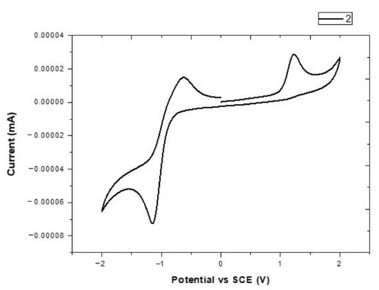 Cyclic voltammograms of compound 2 recorded in MeCN solutions containing 0.1 M tetrabutylammoniumhexafluorophosphate as supporting electrolyte at a scan rate of 100 mV s−1 using SCE as the reference electrode, Pt wire as the counter electrode and material-coated glassy carbon as the working electrode.