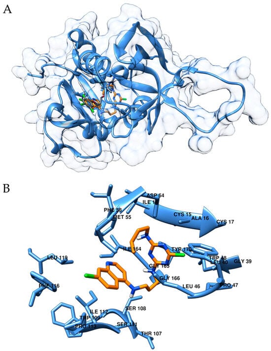 Furthermore, the site-specific molecular docking technique was adopted to investigate, from a theoretical point of view, the interaction motif of compound 5 with DHFR. Thus, the X-ray crystallographic structure of DHFR in complex with the ligand 6,6-dimethyl-1-[3-(2,4,5-trichlorophenoxy)propoxy]-1,6-dihydro-1,3,5-triazine-2,4-diamine was considered (PDB ID 1J3I) []. The robustness of the docking protocol was assessed by re-docking this cognate ligand, as detailed in Section 3. For the studied compound 5, a calculated binding energy value of −8.6 kcal/mol was computed (docking score for cognate ligand: −9.0 kcal/mol). As can be observed in Figure 2A, compound 5 (orange) and the cognate ligand (grey) interact with the same region of the protein. On the other hand, even if the halogenated rings of the cognate ligand and of compound 5 partially co-localize, the two molecules do not perfectly superimpose. Indeed, this could have been expected given the chemical diversity of the derivatives. In more detail, compound 5 interacts with several hydrophobic residues such as Leu46 Ile112, Phe116 and Leu119, Ile 164, Gly165 and Gly166. Trp48, Ser108, Ser111 and Tyr170 are also within interaction distance in the binding pocket (Figure 2B). As mentioned in the Introduction, the design of hybrid compounds has been previously explored in the literature. To assess the relevance of the scaffold of the hybrid antimalarial, we designed a putative primaquine-based analog of compound 5 (inspired to structure h in Figure 1) and docked it to DHFR. As depicted in Figure S21 in Supplementary Materials, this compound also interacts with the same binding pocket, and a comparable docking score was retrieved (−8.7 kcal/mol). The docking findings aligns with the gastrointestinal absorption results from SwissADME, where compound 5 was predicted to have high absorption according to the BOILED-Egg model [] (Figure S20). Additionally, data from admetSAR 2 [] predicted that the compound is orally bioavailable and absorbed in the human intestine. Furthermore, compound 5 was evaluated by predicting its physicochemical properties and oral bioavailability. Based on the calculated physicochemical properties (Supplementary Materials Table S2), compound 5 adhered to all of Lipinski’s rules [], suggesting its drug-like characteristics and a strong potential for oral administration.