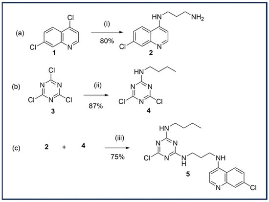(a) Synthesis of N1-(7-chloroquinolin-4-yl)propane-1,3-diamine. (i) 1,3-propanediamine, EtOH, reflux 3 h; (b) synthesis of N-butyl-4,6-dichloro-1,3,5-triazin-2-amine. (ii) Butylamine, acetone, DIPEA, 0 °C; (c) synthesis of 2-(Butylamino)-6-chloro-4-[3-(7-chloro-4-quinolylamino)propylamino]-1,3,5-triazine; (iii) CHCl3, DIPEA and RT to reflux.