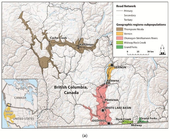In Canada, the western rattlesnake (Crotalus oreganus) occurs in British Columbia (BC), as the province represents the northernmost limit of the species’ range which extends south through Washington, central Idaho, northern California and Oregon (Figure 1a []). Less than 5% of the species’ North American range occurs in Canada, and within the country all five geographic region subpopulations are disjunct from each other and two (Thompson-Nicola, Vernon; see Figure 1) are now disjunct from populations in the United States []. Conservation of this species is further complicated by the fact that rattlesnakes in Canada are persecuted (probably more so than non-venomous snakes), and in addition, the species is cryptic and widely distributed in a variety of vegetation types and elevations [,,].Although globally listed as ‘Least Concern’ by IUCN [] in Canada, the western rattlesnake is listed on Schedule 1 of the federal Species at Risk Act (SARA) as a federally-threatened species at risk []. In BC, western rattlesnakes generally occur in grassland ecosystems which are largely restricted to valley bottoms [,,] and are comprised largely of the Bunchgrass, Ponderosa Pine, and Interior Douglas-fir Biogeoclimatic Zones (BGC []). Western rattlesnakes have also been found in the Engelmann Spruce-Douglas-Subalpine Fir zone []. Only a small portion (estimated at 15%) currently lies within protected areas []. Despite numerous threats, relevant and accurate population estimates and contemporary demographic parameters, as well as detailed assessments of remaining western rattlesnake habitat at local, regional or range-wide extents are limited []. Without accurate population estimates and information on habitat availability for this imperiled species, implementing and monitoring conservation efforts across its range continue to be compromised.