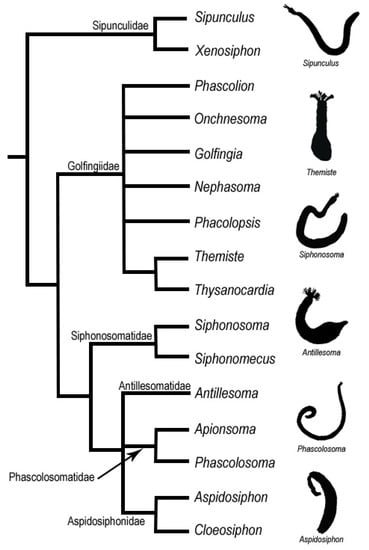 Phylogeny of the Sipuncula (modified from []). Right, exemplar shadows representing one genus from each family.