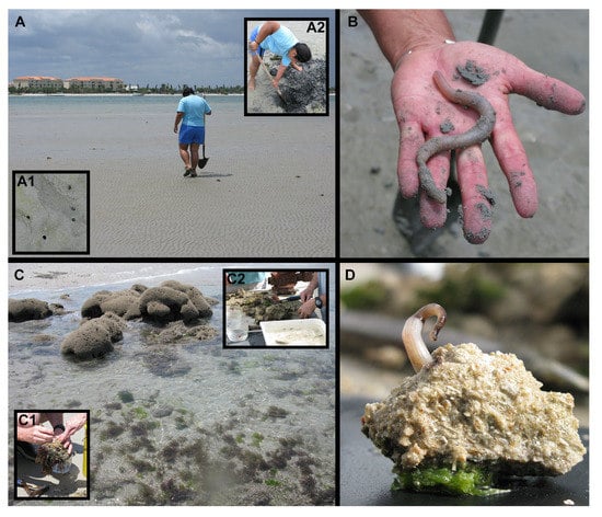 Collecting Sipuncula. (A) Sand bar exposed by low tide, habitat for large sipunculans; (A1) Sipuncula holes; (A2) Digging deep into the sediment searching for sipunculans; (B) Siphonosoma cumanenses found in this habitat; (C) Beach with sabellariid mounds exposed by low tide; (C1) Pieces of polychaete colonies with sipunculans; (C2) breaking the pieces of polychaete colonies searching for sipunculans; (D) Phascolosoma perlucens found living among the polychate colony.
