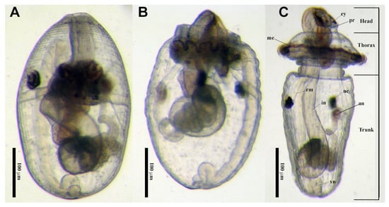 Pelagosphera larvae from Sipunculus sp. (A) Pelagosphera larva with the head and thorax retracted inside the trunk; (B) Pelagosphera lateral view of a larva in the process of extending the head from the trunk; (C) Dorsal view of the pelagosphera larva showing regions of the body and external and internal structures viewed through the translucent the body wall. Abbreviations: an = anus, ey = eye, in = intestine, me = metatroch, ne = nephridia, pr = prototroch, rm = retractor muscle, vn = ventral nerve cord.
