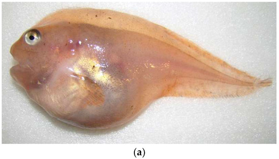 The genus Liparis includes no less than 72 species, being one of the four largest genera of the family [39]. The genus is the most generalized [35,53,56,60,65]. Plesiomorphic characteristics include innumerous vertebrae (31–53), 2–4 pairs of long saber-shaped pleural ribs, two pairs of nostrils, three-lobed jaw teeth in regular rows, and presence of pseudobranchia. There is a large sucking disk (6.4–21.7% SL in diameter) modified from pelvic fins. The shoulder girdle of the pectoral fin possesses four notched radials and three large interradial fenestrae. The pectoral fin is notched and may include a large number of rays (up to 46). The anus and genital openings are open closer to the anal fin than to the ventral disk. In skin, green and orange pigments are present; the color is usually olive-brown, mottled, or striped. The length of most Liparis usually does not exceed 15–30 cm; the largest known length (L. ochotensis) is 74 cm [121]; the weight sometimes reaches 6 kg [122].