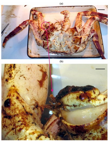 The red king crab, Paralithodes camtschaticus (Tilesius, 1815), is a well-known crustacean species that is highly appreciated by fishermen and consumers for its large size and excellent quality of its meat and by-products [,,,,,]. This species is native to the North Pacific, but currently, it also occurs in the Barents Sea after the transoceanic introduction from the Sea of Japan and Sea of Okhotsk conducted by Soviet scientists in the 1960s []. By the mid-1990s, the crab has formed a new self-sustaining population that currently supports both commercial and amateur fisheries in Russia and Norway [,]. Although some alterations in the structure of benthic communities have been reported after this introduction [,,], the commercial fisheries of major fish and shellfish resources were not affected [,]. The coastal zone of the Barents Sea is a nursery and recruitment area for this king crab [,,,] whereas the open sea is occupied by large specimens [,].
