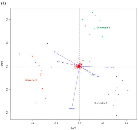 Visualization of the distance-based redundancy analysis (db-RDA) for the Bacteria domain, using (a) the mineralogy of the rock surfaces for the sessile community and (b) the geochemical parameters of the water in the bioreactors for the planktonic community. Samples from bioreactor 1 are in dark orange, those from bioreactor 2 are in green, and those from bioreactor 3 are in grey. Red crosses represent the ASVs. IO, iron oxide; M, mica; Q, quartz; RF, red feldspar; WF, white feldspar; abbac, bacterial absolute abundance; DIC, dissolved inorganic carbon; DOC, dissolved organic carbon.
