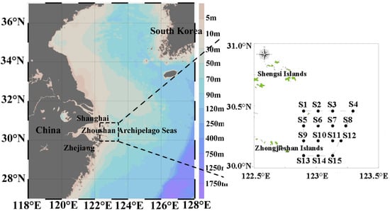 In 2022, four cruises were conducted to sample fishery resources in February (winter), April (spring), August (summer) and November (autumn), respectively. A total of 15 stations (Figure 1) were surveyed in the offshore of the Zhoushan archipelago seas in each season. The bottom trawler had a weight of 242 t, engine power of 441 kw, with the trawling net a hull length of about 36.8 m, width about 6.8 m, and mesh size of 20 mm for the cod-end. The trawling time for each station was around 1h, with trawling speed around 3.0 kn. The fisheries samples were all collected and frozen in the vessel and brought to the laboratory after the cruises. All the samples were identified to taxonomy level and weighted. The operations were carried out in accordance with the requirements of the Marine Survey Code (GB/T 12763.6-2007) [] and the Marine Fishery Resources Survey Code (SC/T 9403-2012) [] of China. The abundance/biomass was expressed as the number/weight of organisms per hour (unit: ind./h) for each species in each station and each season.