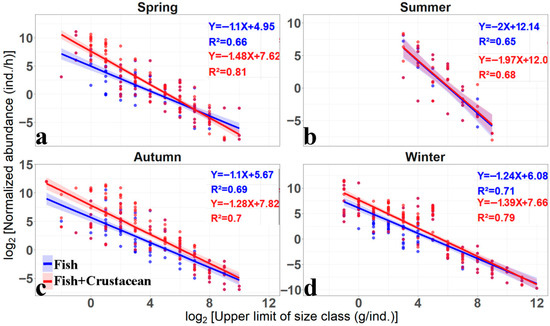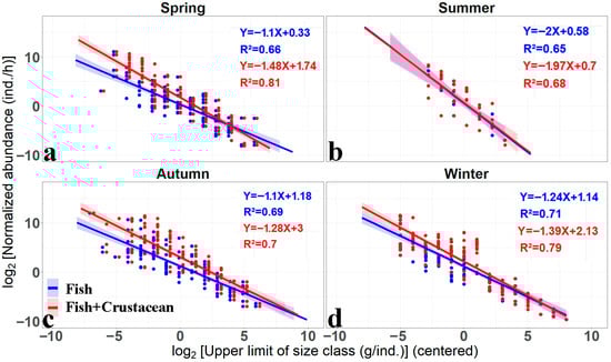 The seasonal variation in normalized abundance size spectrum of fish with (red curve) or without (blue curve) crustaceans by log-linear regressions. Note: the regression parameters (slope, intercept and R2) were shown in the top right of each figure in spring (a), summer (b), autumn (c) and winter (d).
