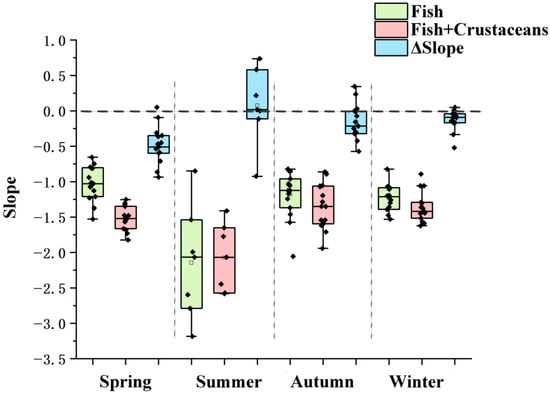 To minimize errors, some stations with small or missing sample sizes, and poor fitting (R2 < 0.4) were deleted. The significance of seasonal differences in slope (fish only, fish and crustacean, difference between the above two groups) was tested using one-way analysis of variance (ANOVA). The seasonal comparisons of slope difference were also shown in the boxplot. In the ideal state, i.e., when the surveyed community is undisturbed, the slope is −2, the intercept and correlation coefficient are positively related to community productivity, and the deviation of the community from the steady state []. The spatial distribution of slope and intercept was used to analyze the spatial pattern of the fisheries community. The spatial difference with or without crustaceans was also used to understand the geographical influence of crustaceans.