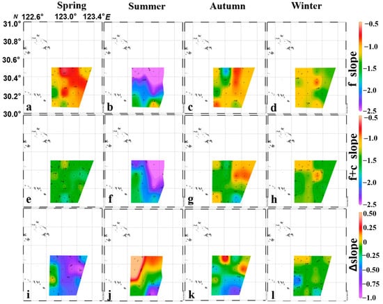 The spatial distribution of f_slope and f+c_slope were heterogeneous in summer and autumn (Figure 5b,c,f,g), while they were more homogeneous in spring and winter (Figure 5a,d,e,h). As described in the above section, f_slope and f+c_slope were deeper in summer, and shallower in other seasons in all the spatial grids (Figure 5a–h). ∆slope indicated the adding effect of crustaceans, and it showed a strong steeping effect in spring and autumn, especially in the offshore of the study regions in the spring (∆slope < −0.5, Figure 5i), and south of the study regions in the autumn (∆slope < −0.5, Figure 5k). The mild steeping effect was found in the majority of southern study regions in the winter (∆slope < −0.25, Figure 5l). Compared to the steeping effect in other seasons, a strong adding (curve becoming shallow) effect was observed in most northern study regions in the summer (∆slope > 0, Figure 5j).