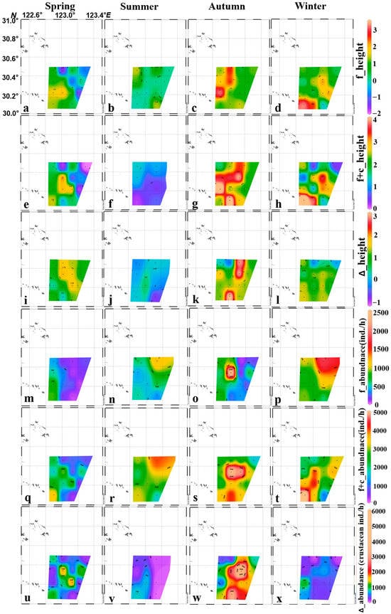 The spatial distribution of f_height and f+c_height showed a strong heterogeneous pattern in autumn and winter when abundance was high, while the distribution was relatively homogeneous in spring and summer with lower abundance (Figure 6a–h). The distribution of f+c_abundance also showed a similar pattern of that for f_height and f+c_height, while the distribution of f_abundance was not consistent with f_height, because of low abundance in autumn (Figure 6m–t). ∆abundance reflected the abundance of only crustaceans, the ∆height indicated the effect of adding crustaceans, the distribution of these two parameters showed consistent patterns in all the seasons. More crustaceans were observed to be added to the whole community in spring and autumn than in summer and winter, especially in the east offshore of the study region. The ∆height and ∆abundance showed more homogeneous distribution in summer and winter, when the crustaceans were few (Figure 6i–l,u–x).
