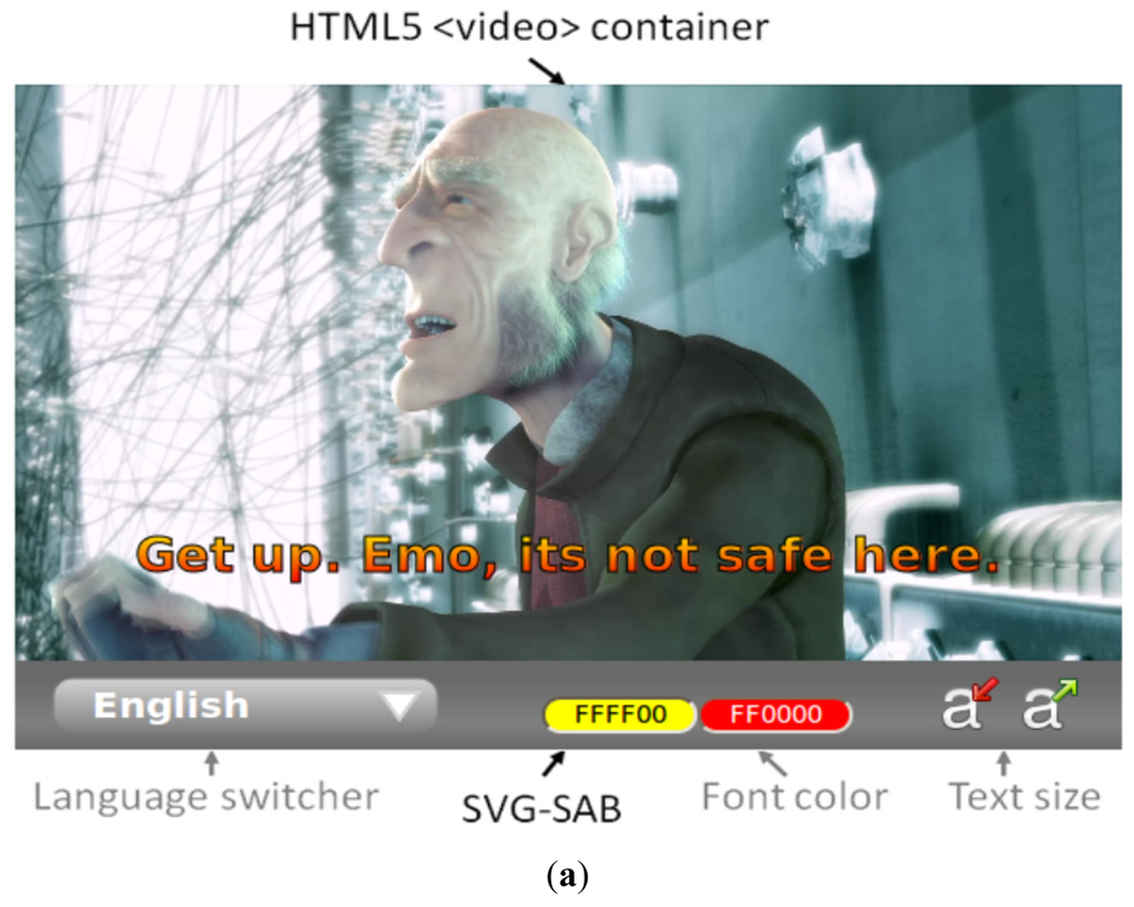 When a language switch is applied, the widget removes the previous subtitles and adds the new ones without a delay in synchronization because the SMIL timeline is responsible for presenting each subtitle at the correct time. The SVG-SAB widget also enables modifications to the subtitle text color and size in order to enable its adaptation to the requirements of the video, application, user and context e.g., text color can be adapted to achieve a better contrast, depending on the lighting content and context. Adaptation of the subtitle may also be necessary in order to overcome user difficulties in accessing content. The use and functionality of these subtitles is multiple: for language teaching and language therapy [3], for people with visual impairments or color blindness, for the elderly and people who speak other languages, or for those with literacy or comprehension difficulties [17,18].