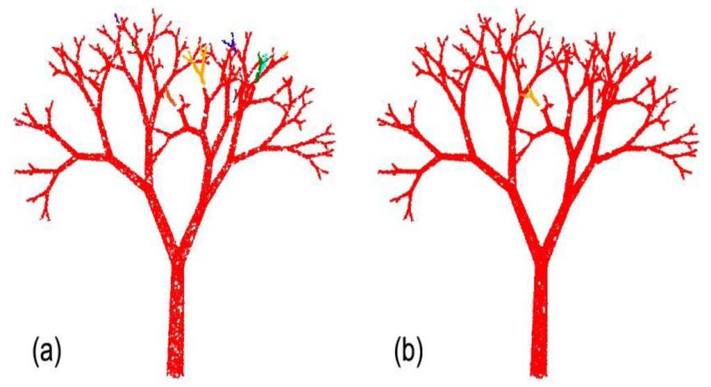The use of supervised tools improved model reconstruction, mainly by (i) connecting components that were isolated because of occlusion (i.e., gaps of 3 cm); and (ii) creating short branches. After three hours of work, reconstruction increased to 78% of total number of axes detected and 93% of total cumulated length (Table 1). Better reconstruction seems impossible due to point cloud quality, especially in the lower part of the tree where branches are severely tangled. The accuracy of semi-supervised reconstruction makes it suitable for botanical or architectural studies, such as the investigation of the exploration (long axes) vs. exploitation (short axes) trade-off in trees [28]. One should acknowledge, however, the expense of time that was associated with this gain. When the aim of extracting tree metrics such as tree height and diameter or crown volume are for forestry purposes [8,17], this precision is obviously not necessary and the automatic method remains appropriate.