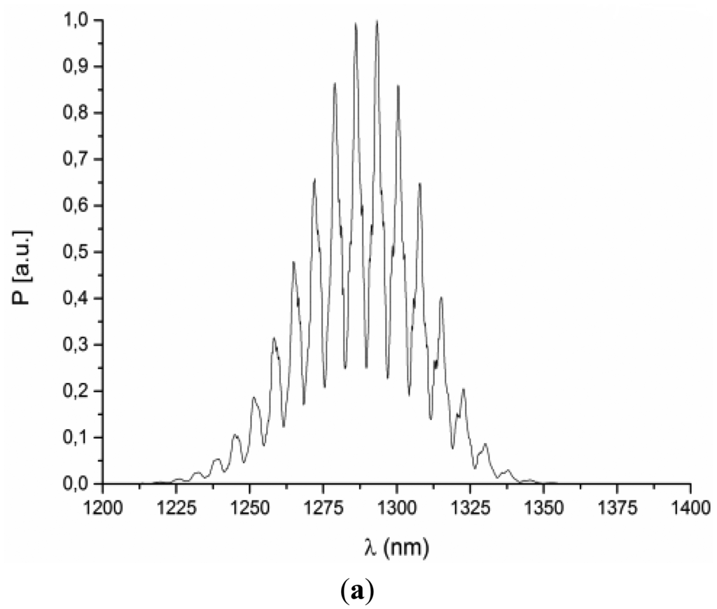 An experimental setup was designed and built accordingly to the layout shown in Figure 2. A superluminescent diode (SLED) type S1300-G-I-20 (produced by SUPERLUM, Cork, Ireland) with peak wavelength λP = 1,290 nm, Gaussian spectral density and ΔλFWHM = 50 nm was used as the broadband source. An Ando AQ6319 optical spectrum analyzer (ANDO (recently Yokogawa Electric Corporation) Tokyo, Japan) with resolution bandwidth set to 1 nm was used in the detection setup. All interconnections, as well as the coupler, were made from standard single-mode telecommunication fiber SMF-28.