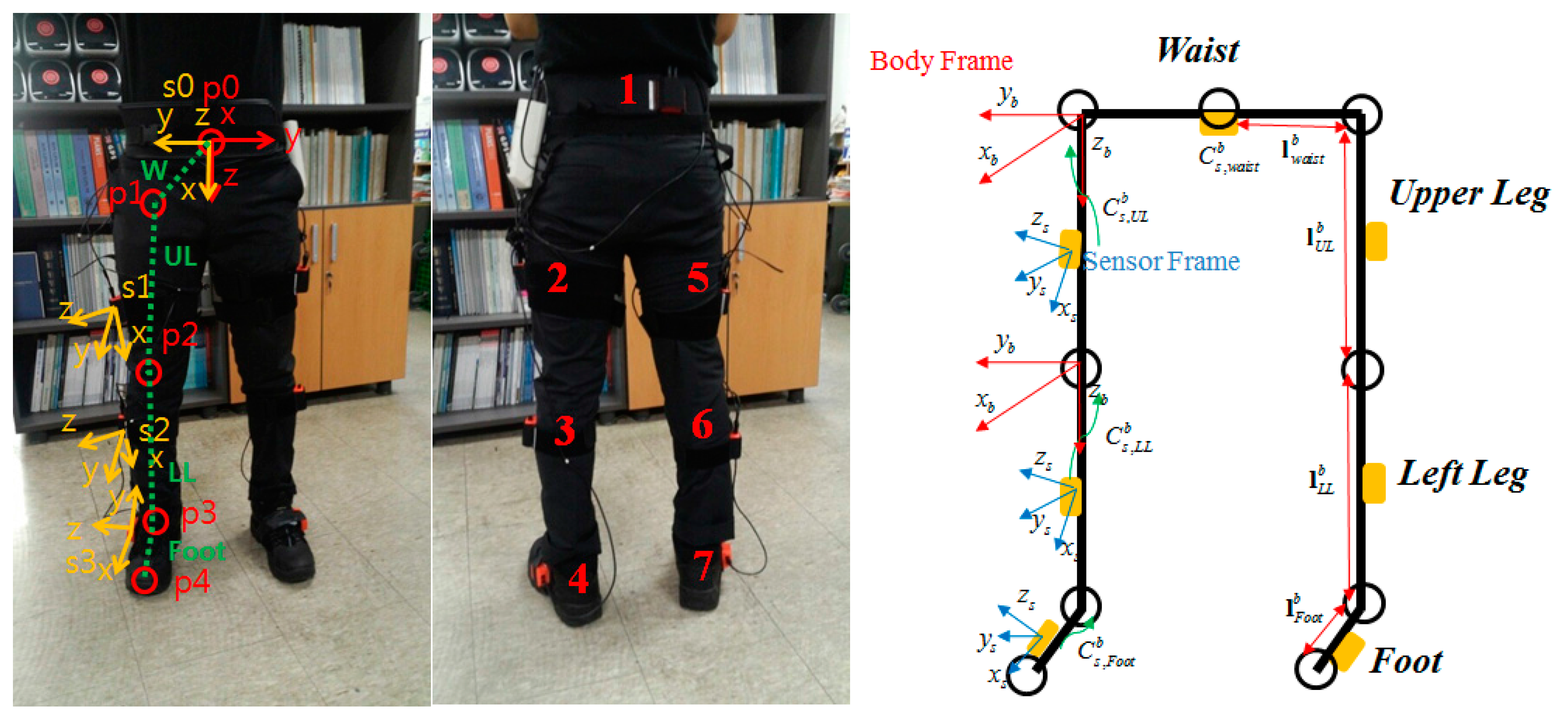 Figure 1 shows the front and back of the subject with the seven sensors mounted on the body. The sensor outputs are wirelessly sent to the PC through USB receivers and Bluetooth modules. The Xsens XBUS systems are used for the IMU device and logger, which receives simultaneous data from every sensor. Each of these sensor modules includes a MEMS grade tri-axial accelerometer, a tri-axial gyroscope, and a tri-axial magnetometer. The system uses the magnetometer only for estimation of heading with the waist-mounted sensor because any disturbance in the magnetometer can greatly affect the other positions. The seven inertial sensors are attached to the feet, lower legs, upper legs, and the center of the waist. Each sensor is tightly wrapped in order to minimize any skin motion effects. The length of each joint is previously measured for the kinematic relation calculation. The start and end points of the segments are located at the center of the joint as illustrated in Figure 1. The sensor and body frames are defined as follows: the red arrows represent the definition of the body frame. The z-axis points to the center of the Earth, and the x-axis points the front of the subject. All joints use the same axis frames. The yellow arrows show the sensor frames. A kinematic model is used to calculate the position and velocity of waist rooted from the foot position. Detailed equations for the kinematic model will be described with Equations (13) and (14). After calculating the position of the waist, the position of the feet could be calculated using a kinematic model again like Equation (18).