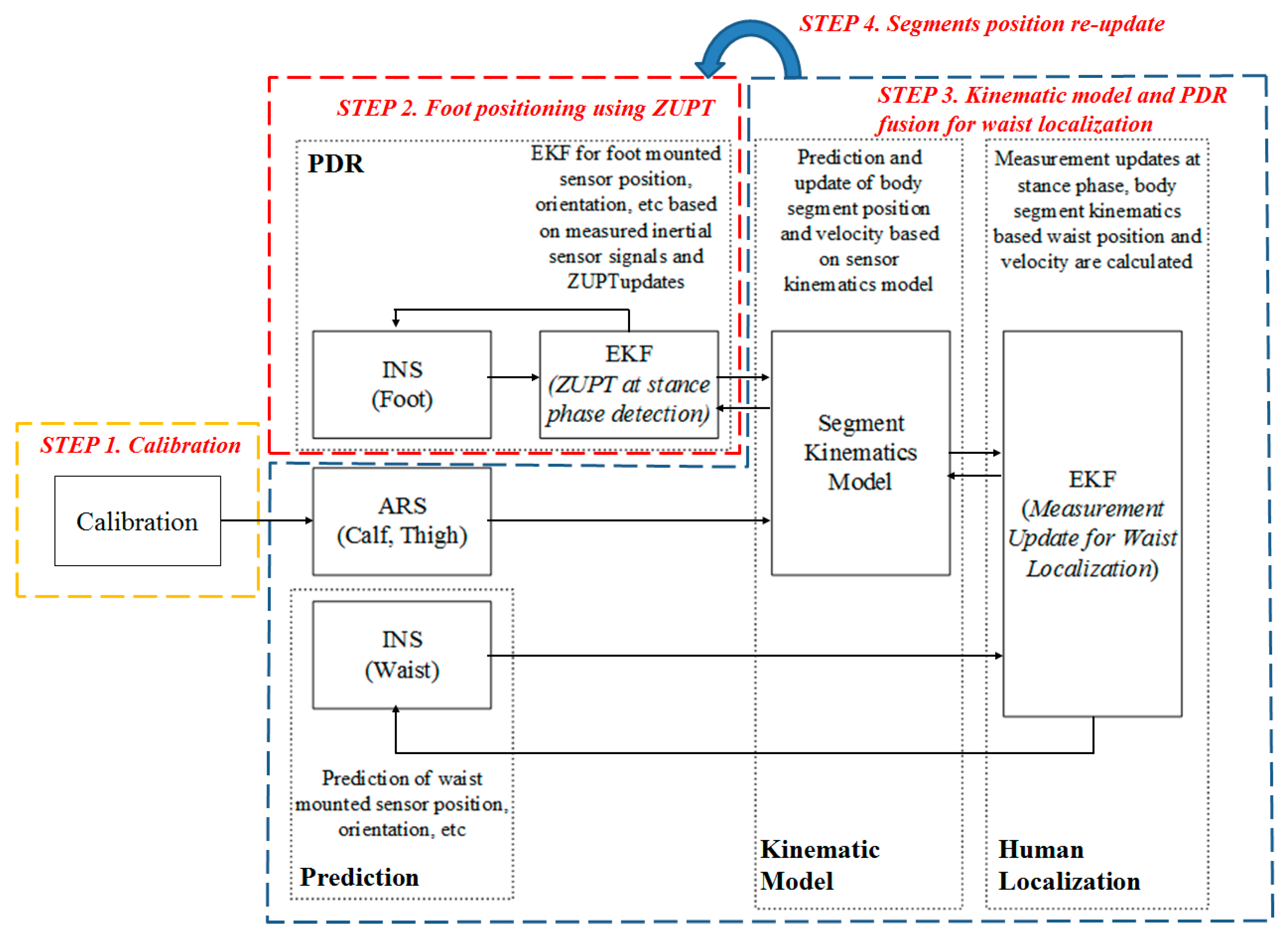 The summary of the proposed algorithm can be explained with four steps as shown in Figure 2. First, a calibration process is required. In the calibration, misalignment of the calf and thigh sensor are calculated. The second step of the algorithm is foot positioning using ZUPT. When the stance phase is detected, zero velocity measurements are updated during the phase. Step 3 is the waist localization part which is calculated by means of kinematic models. Position, orientation and sensor errors of the waist attached sensor are estimated with the measured position and velocity of the waist inferred from the foot position using the kinematic model. In order to use the kinematic model, the orientations of leg segments are required and estimated with a typical ARS algorithm and the results of the calibration step. Step 4 re-updates the segment positions. The positions of calf, thigh and foot are calculated with the kinematic model, and the EKF for the foot mounted sensor uses the corrected foot position measurement. Detailed operation of each step will introduced in Section 3.