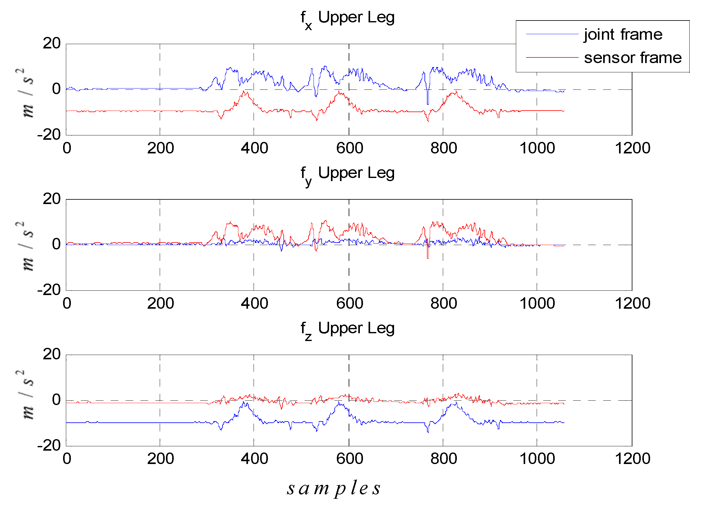 Accelerometer signals of upper leg during calibration motion which represented at sensor frame (red line) and joint frame (blue line).