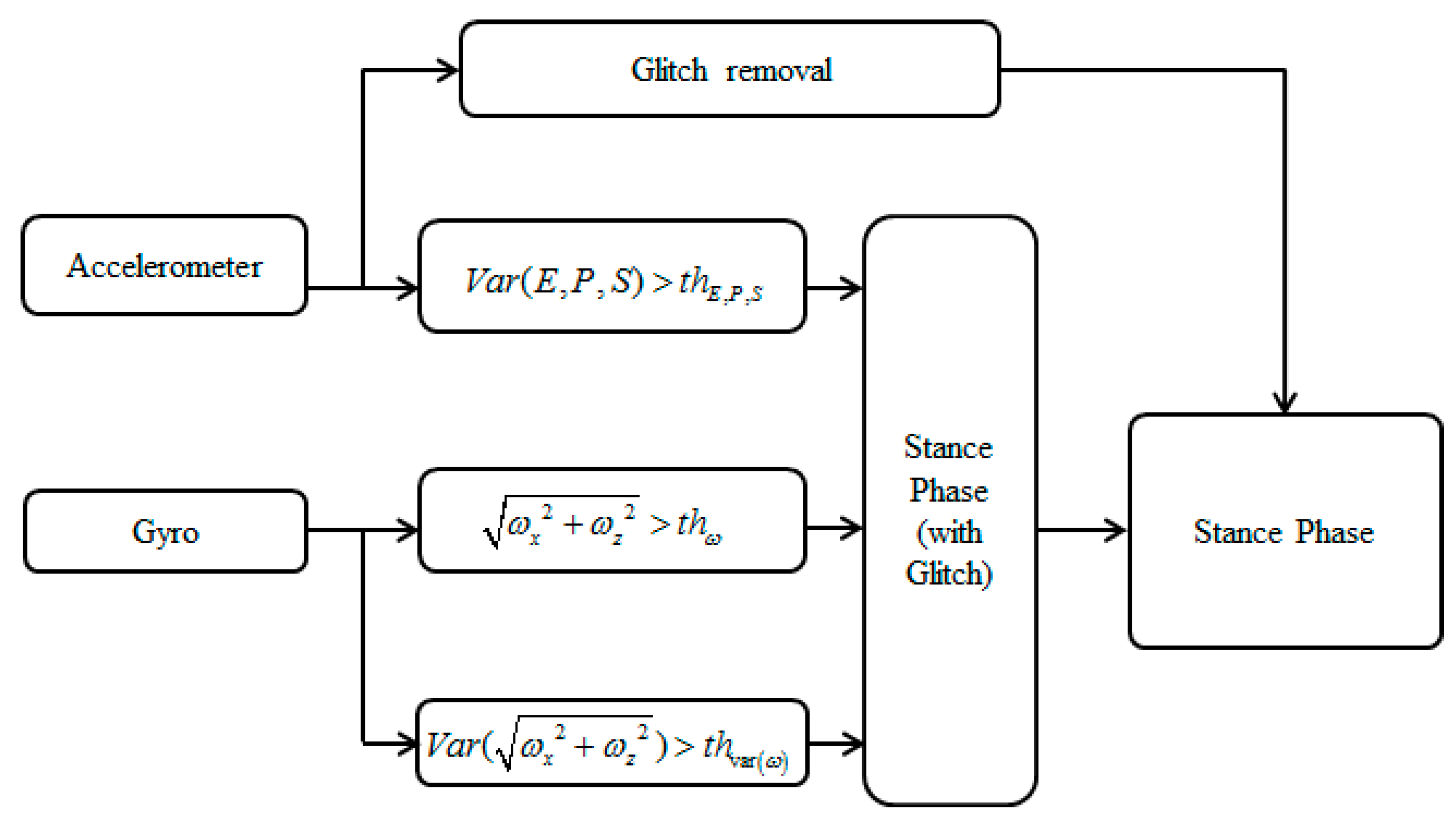 The gait can be simply divided into the stance phase and swing phase. The stance phase represents a section of the contact between the shoes and the ground. Most algorithms in the literature generally determine the stance phase based on gyroscope and accelerometer signals. However, methods that simply use sensor signals and classify walking status by the threshold suffer problems of robustness for various motions. In order to correctly detect the stance phase, this study employs modified signals and a combination of them, which show significant differences for all motions such as slow walking, crawling and random walking [47].