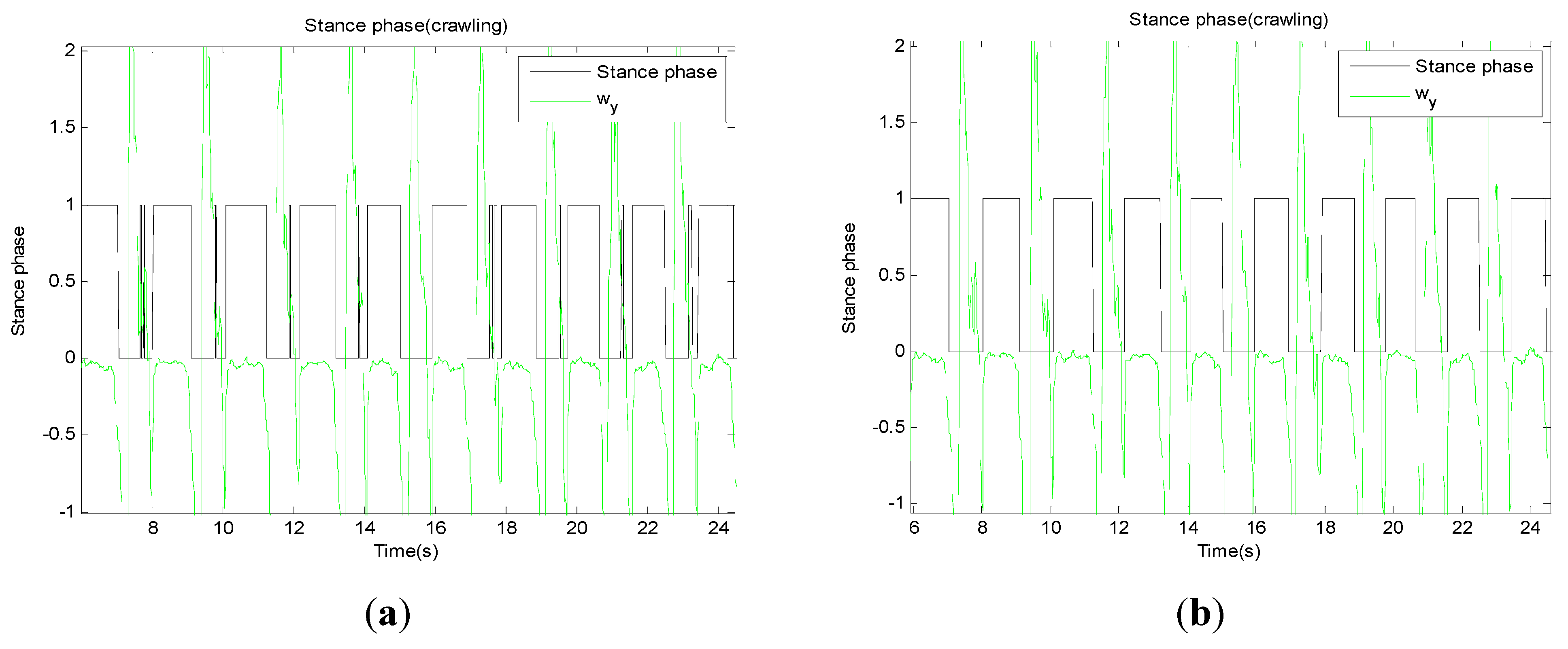 Result of the stance phase detection. Green line shows y-axis gyro and black line shows phase condition. (a) shows result of stance phase detection without glitch removal and (b) shows without it.