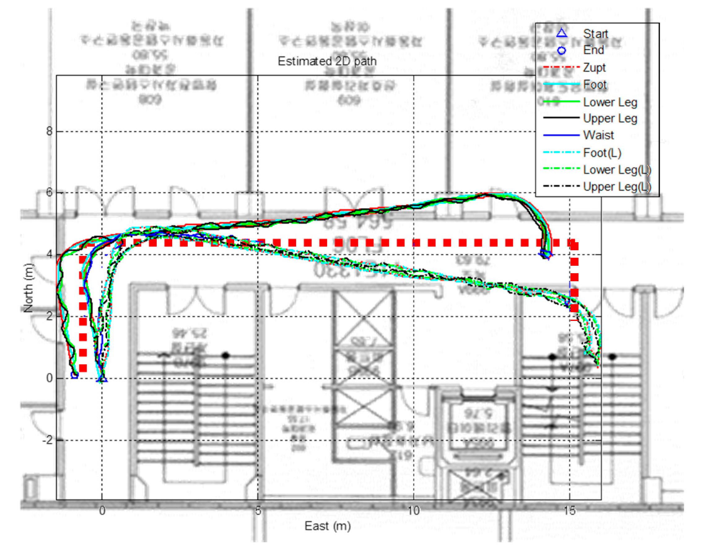 The red dotted line is the actual trajectory. The solid lines represent the position of the right leg segment, which updates using the kinematic model rooted on the right foot position, and dotted lines represent the position of the left leg. The initial heading of each leg is provided, and the trajectory is updated according to the measured gyro signals. The subjects are asked to walk along the actual trajectory lines and return to the starting position. The two algorithms deliver two distinct directional trajectories although the end positions are close to the starting point. In this case, it is not possible to conclude on which trajectory the real position of the pedestrian is. Therefore, this study proposes integrating a kinematic model with the PDR using multiple wearable sensors, which enables one to precisely locate the pedestrian.