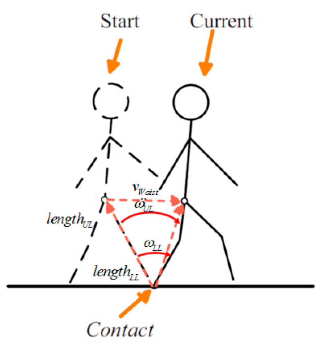 Velocity of the waist is calculated at stance phase using the biomechanical model. Figure 11 shows the concept of the velocity model. During the stance phase, movement of the leg creates a pivot motion with the center of the shoe. In between the shoe and the waist, there are three segments, i.e., lower leg, upper leg, and waist, and the velocity of the waist is computed as the sum of the three pivot movements. Equation (13) describes the kinematic model of velocity measurement and is applied to the left and right legs: