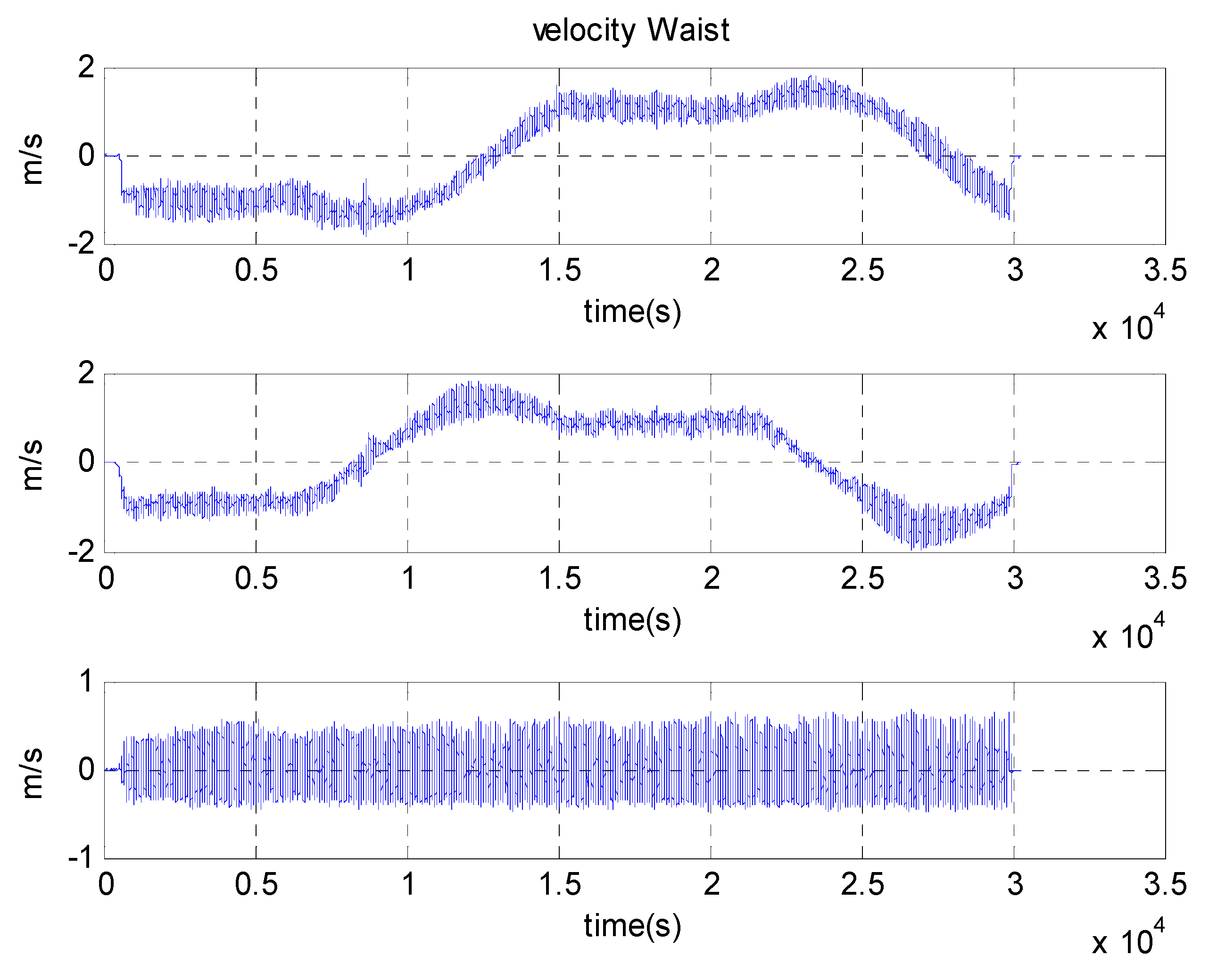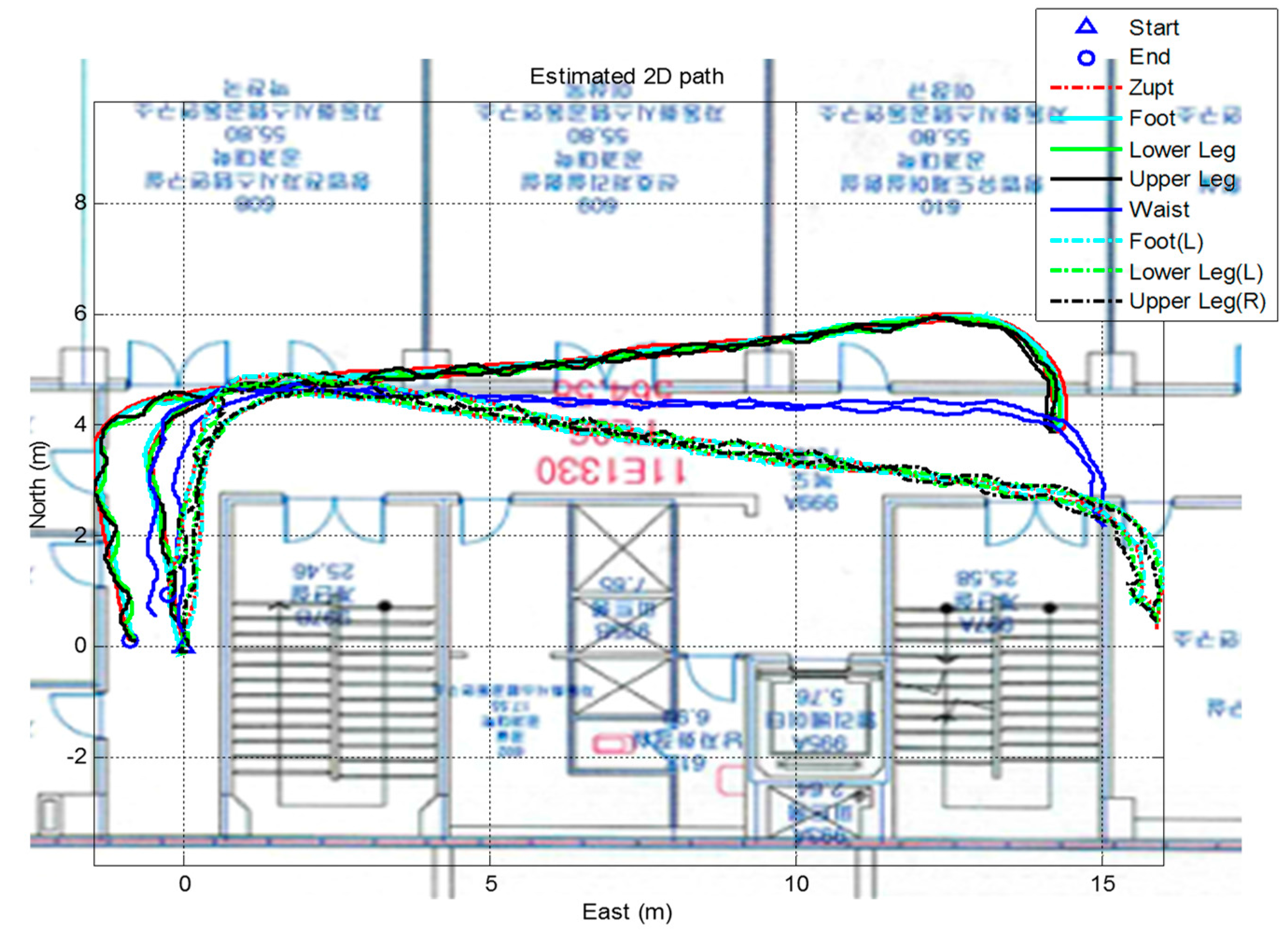 Figure 19 and Figure 20 show the results of the estimated velocity of the waist and attitude of the segments during the 400 m-walk test. The velocity measurement, which is calculated from the kinematic model, correctly estimates the waist velocity. The true velocity of the pedestrian is not acquired in this test, and the accuracy of the results cannot be directly evaluated. However, comparing the magnitude of the velocity represented in NED frame to the Google map allows the filter to provide correctly estimated results. In the same way, the attitude of segment represented in Figure 20 shows that it is estimated correctly in physical meaning. The roll is stable near the origin, and the pitch waves periodically especially for the upper and lower legs. The yaw angle of the waist also nicely follows the heading of the waist, which contains the magnetometer information.