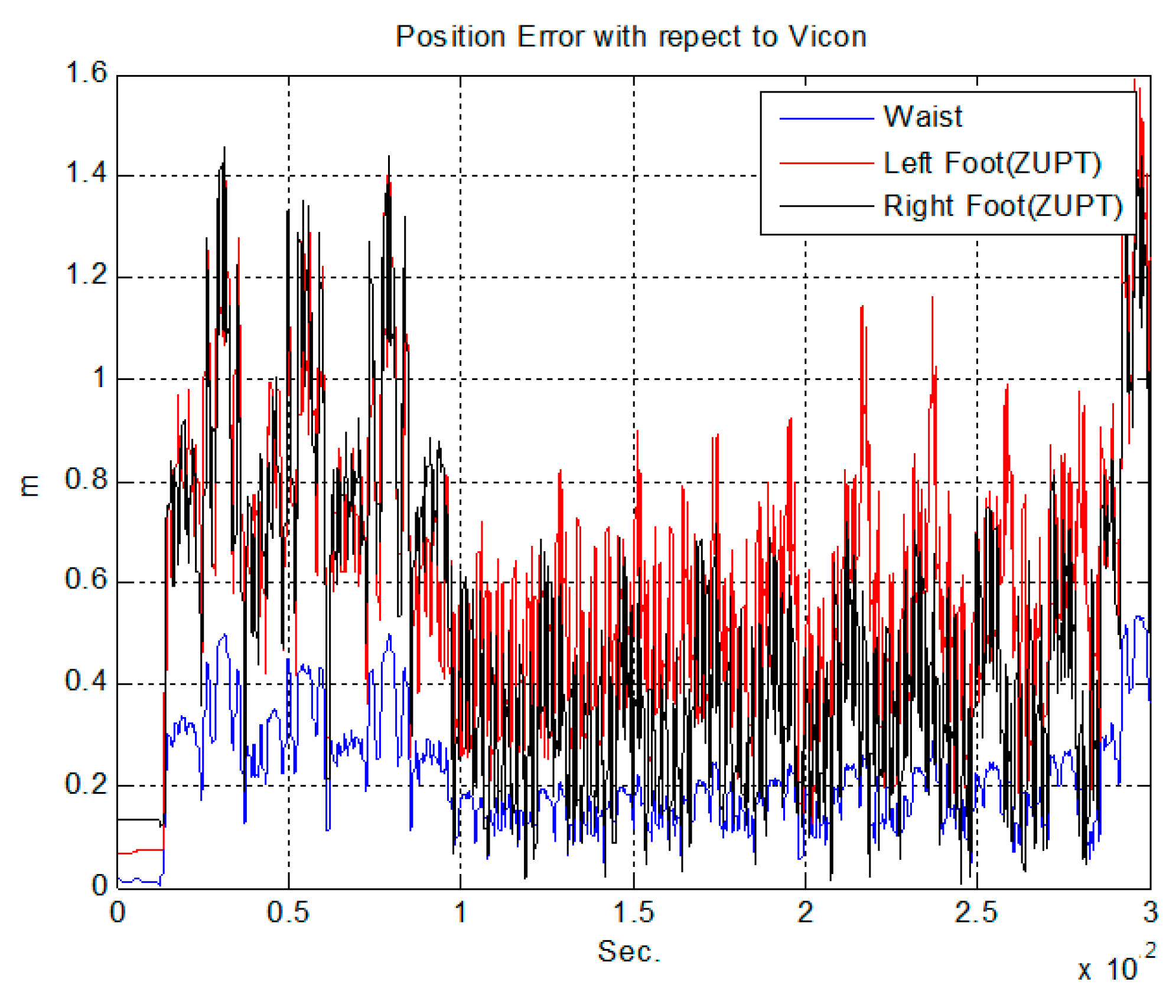 Position error of the proposed algorithm and ZUPT algorithm with respect to the Vicon data.