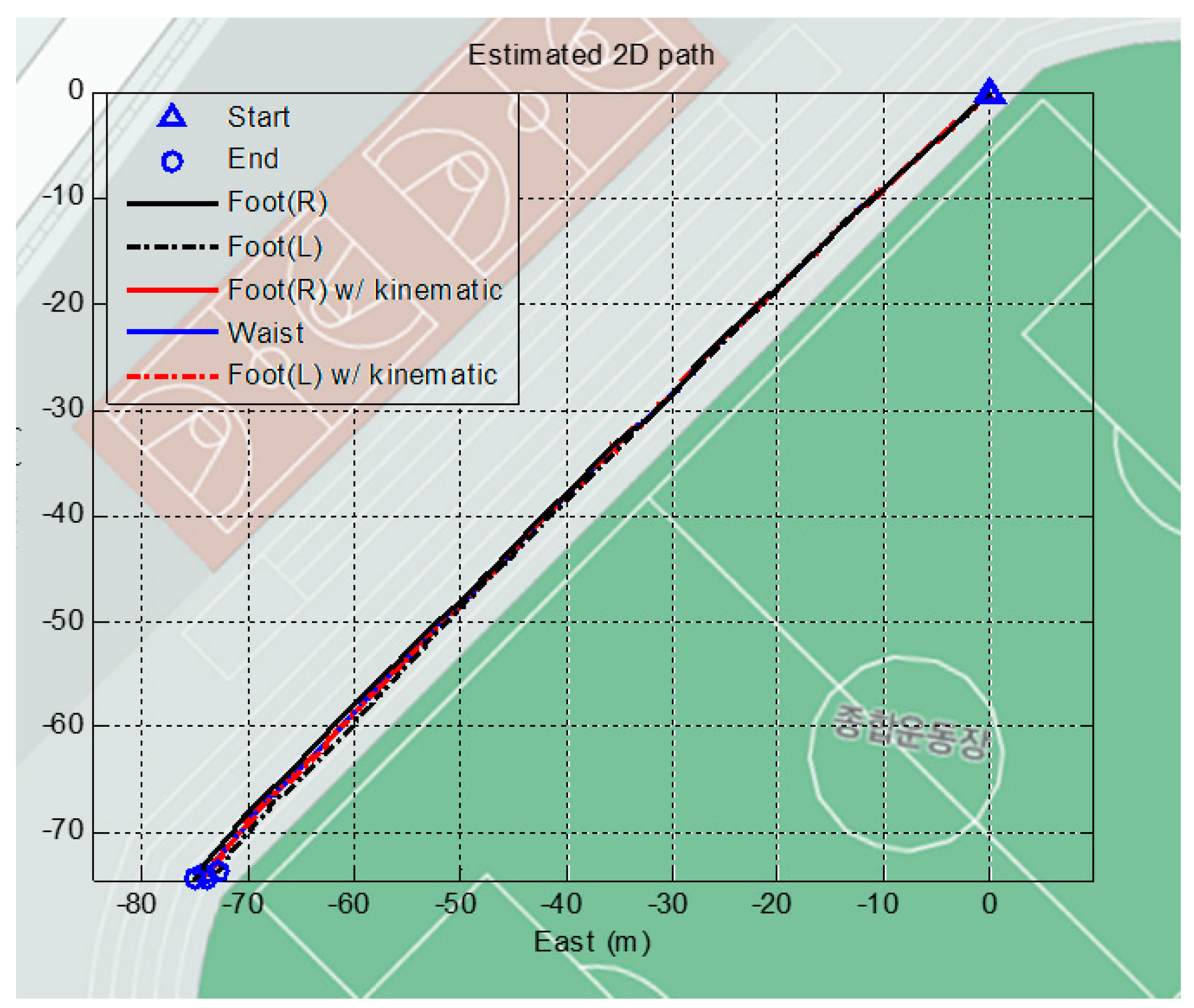 The algorithm is verified in an outdoor environment as well. The next test consists of two types of trajectories on the outdoor field: a straight line and a closed loop. First, the subjects are asked to walk along a straight line on the ground. This test verifies the performance of the proposed algorithm when no cornering is involved. The ZUPT updates the attitude of the foot-mounted sensor using only the gyro. Consequently, the yaw angle is observable only when cornering occurs. However, the proposed algorithm uses a magnetometer for the yaw angle, resulting in observations regardless of the course. Figure 16 shows the result of the straight line trajectory on a Google map. The blue line shows the position of the waist using the proposed algorithm, and red line shows the position of the feet, which is updated using the measured position of the waist. The walk of roughly 106 m straight line results in the distinctive paths depending on the algorithms. The two end points deviate over 2 m from each other.