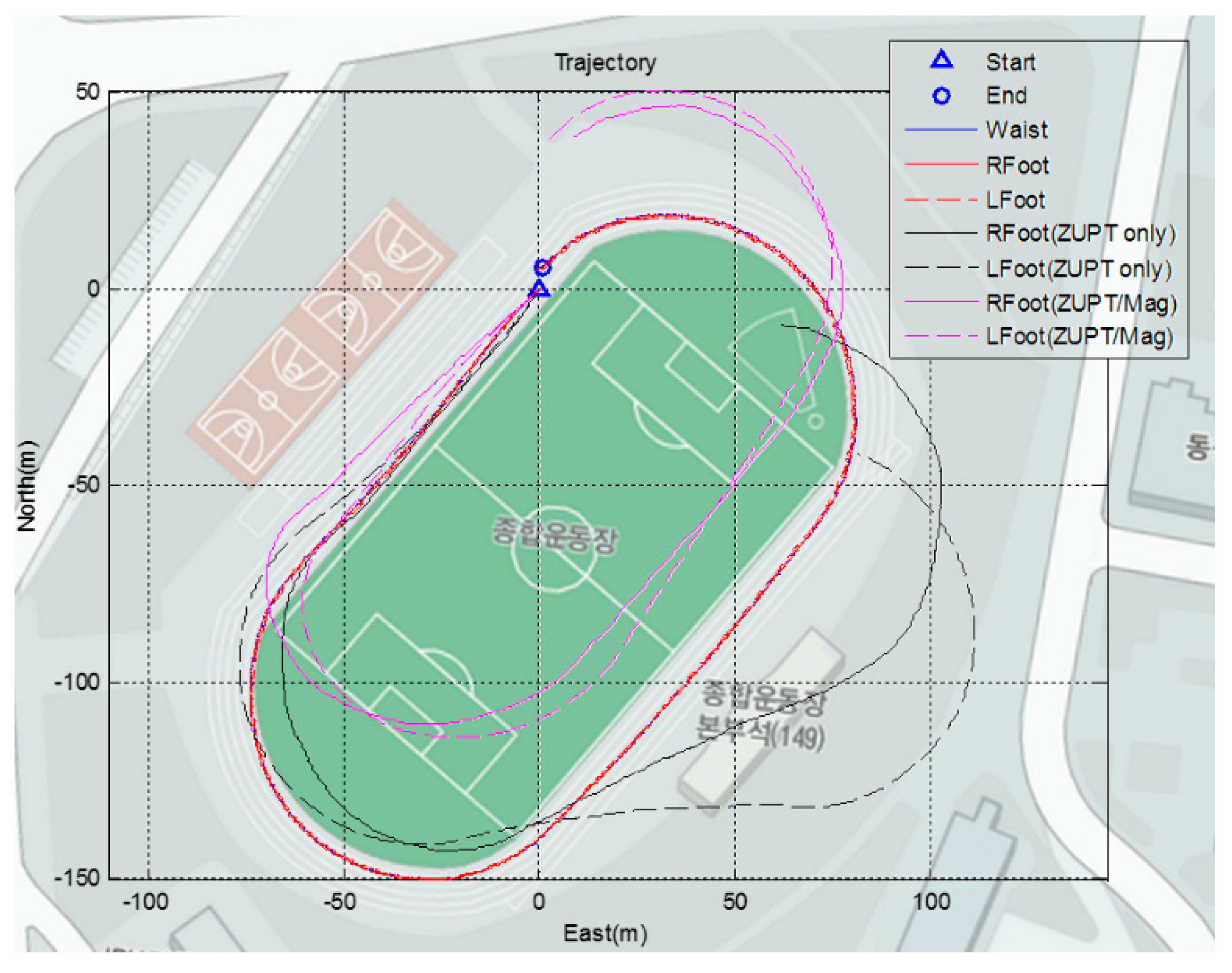 Another outdoor test is conducted on a long distance closed loop. The subjects are asked to walk along the running track at a normal speed. The total distance of the trajectory is about 400 m. Figure 17 shows the results of the proposed algorithm in red and blue. The results of the PDR of the feet are represented in black, and the result of the ZUPT algorithm fusion with the heading of the waist, which is calculated using a magnetometer, is represented in magenta. It is noticeable from the figure that only the proposed algorithm yields trajectories close enough to the actual map. Furthermore, all the segment trajectories are placed near the waist trajectories, meaning that the positions of the segments are properly associated with physical coverage. The pure ZUPT algorithm applied to the foot yields curved trajectories due to the gyro bias. Using the yaw of the waist mounted sensor (magenta line), the ZUPT combined with corrected heading fails to estimate the actual human position, especially during cornering.