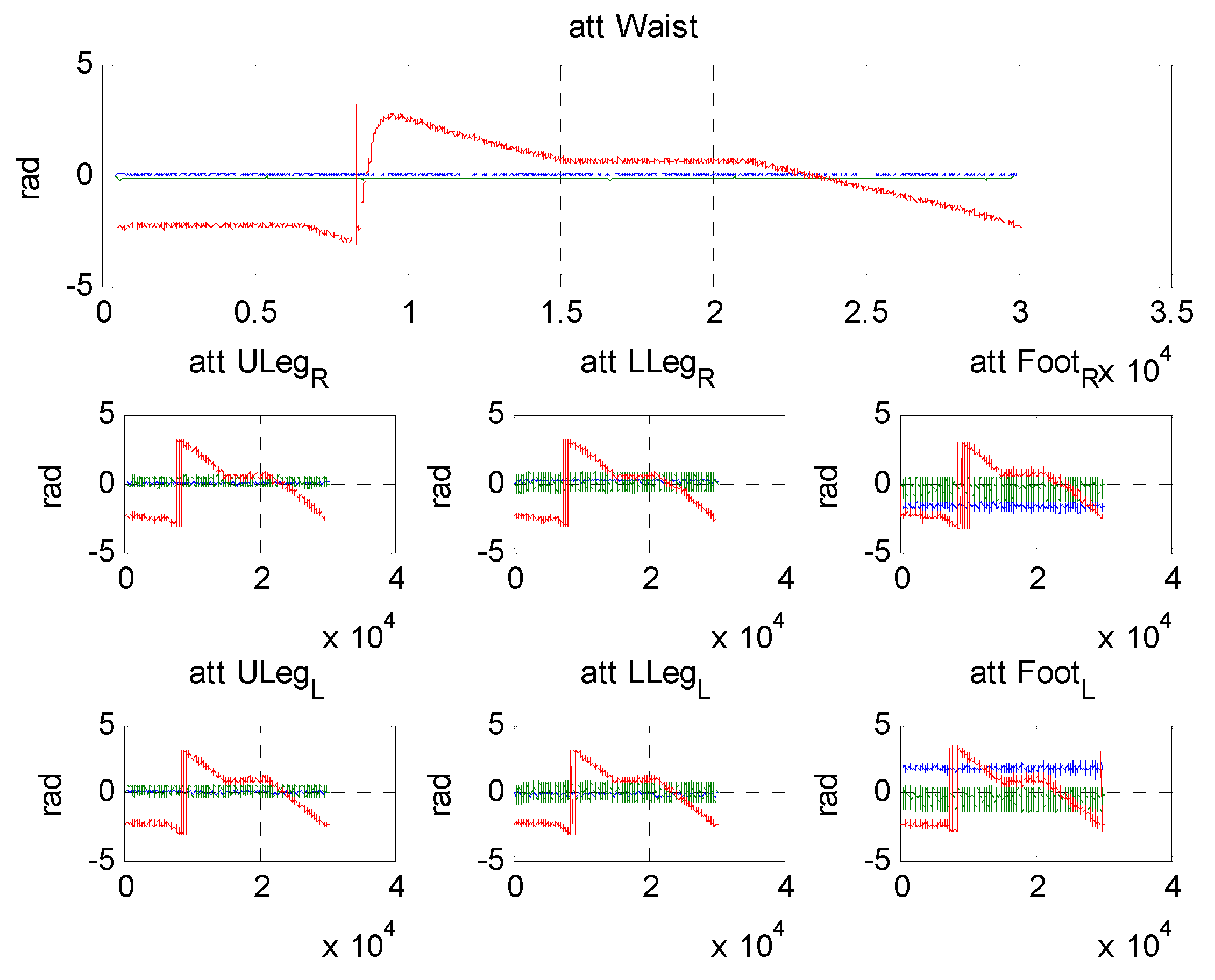 Results of estimated attitude of all segments during long distance trajectory (blue: roll, green: pitch, red: yaw). Attitude of right leg segments located at second row, and left leg segments located at third row.