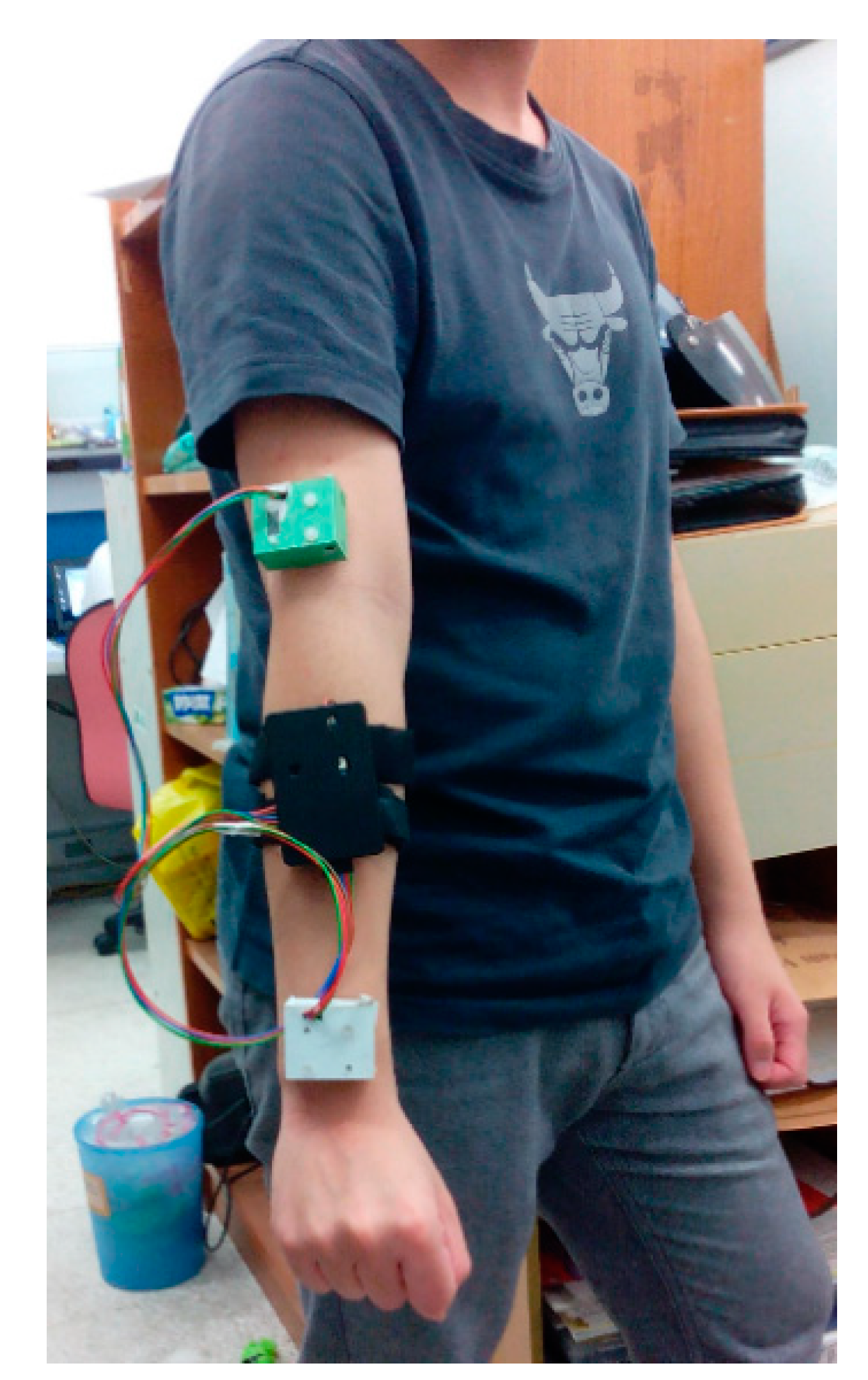 Implemented two-channel wireless IMU system mounted on the upper extremity of a healthy adult.