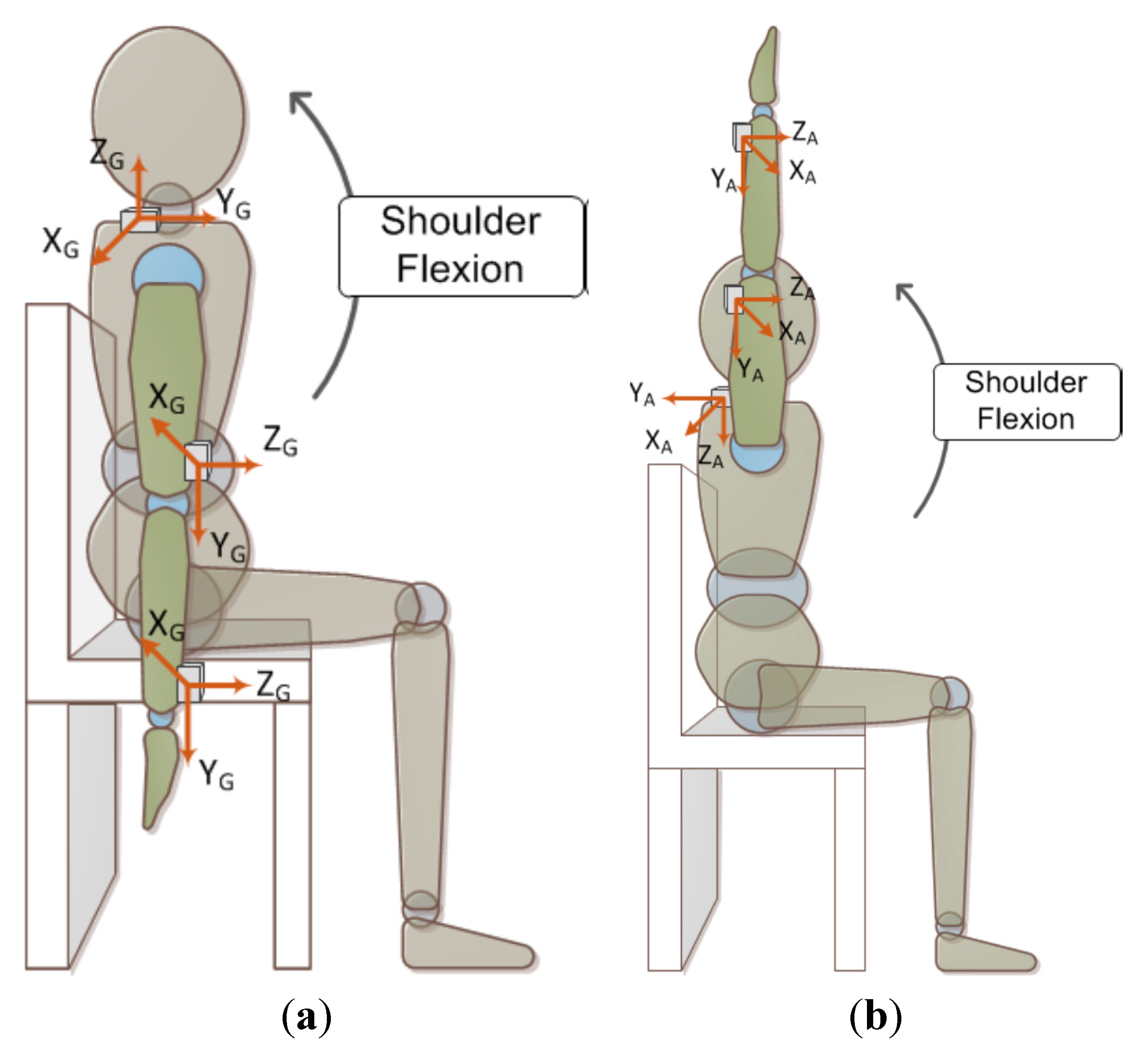 Illustration of sensors’ placement and assessment motion. (a) The initial position of shoulder flexion and motion direction, and the 3-axis directions of gyro marked by the subscript “G”; (b) The end position of shoulder flexion, and the 3-axis directions of accelerometer marked by the subscript “A”.