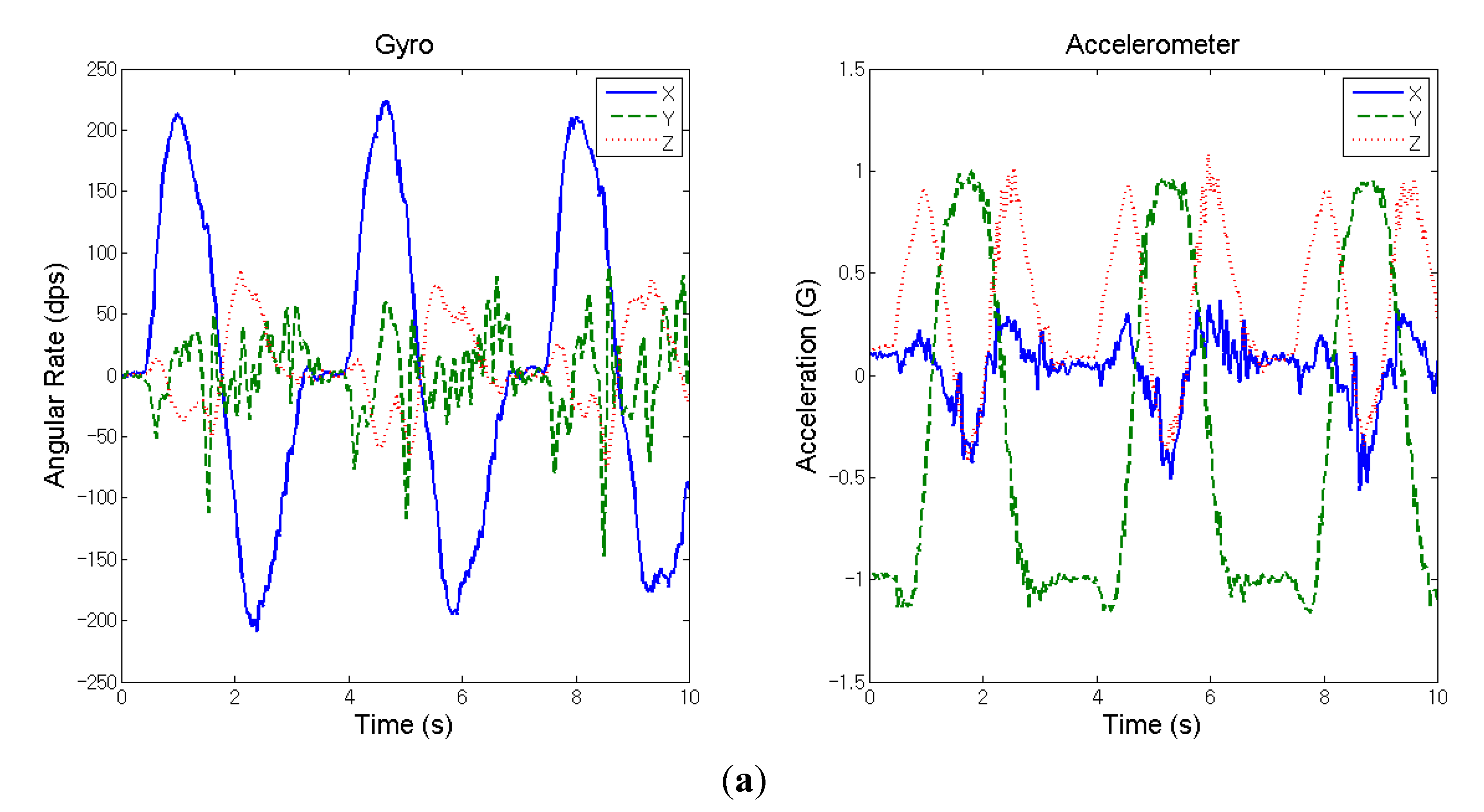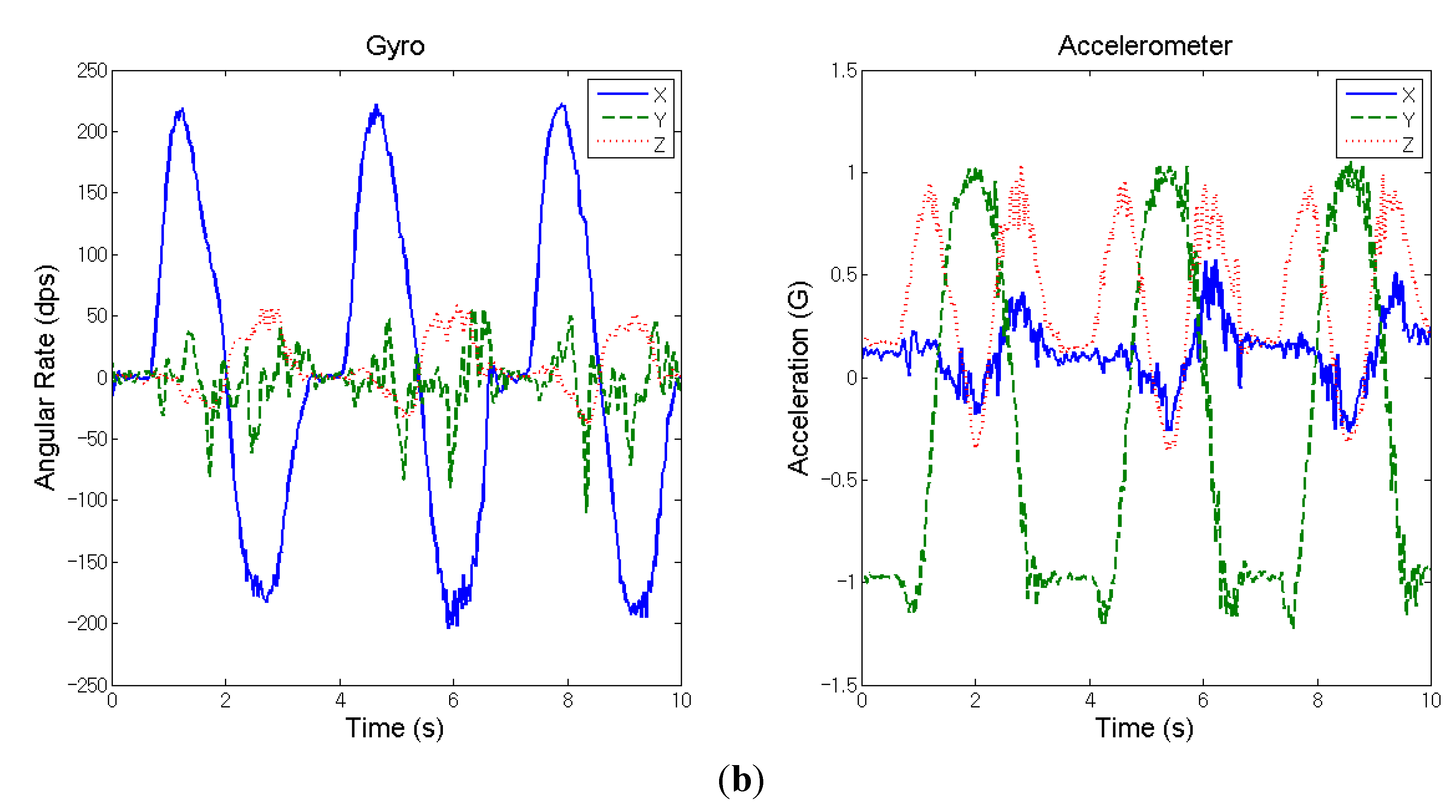 Measured inertial signals from the wrist of a healthy adult during the movement of shoulder flexion (three cycles). (a) Dominant hand; (b) non-dominant hand.