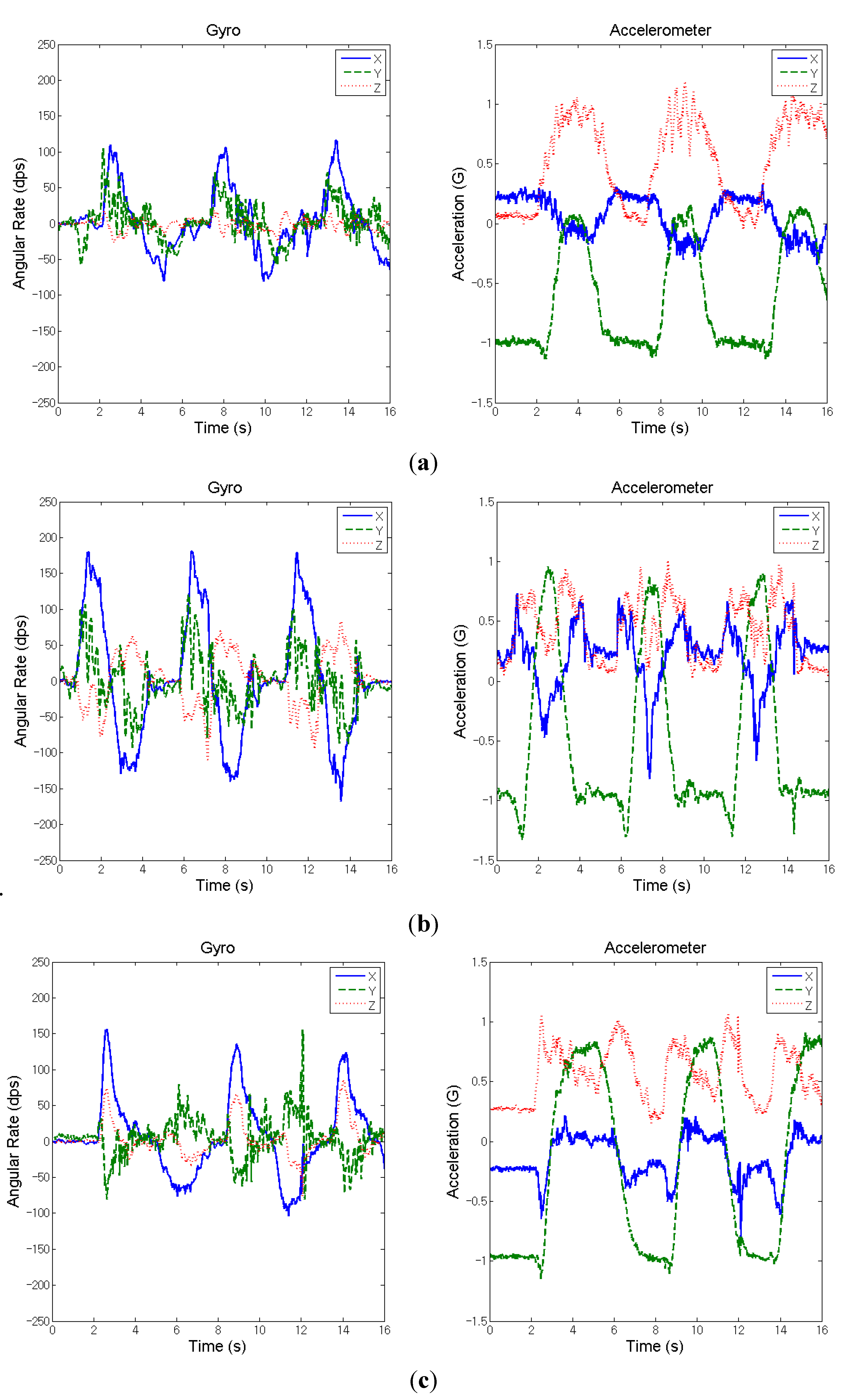 Measured inertial signals from the wrist of a stroke patient during the movement of shoulder flexion (three cycles). (a) Affected side (before treatment); (b) affected side (after treatment); and (c) unaffected side.