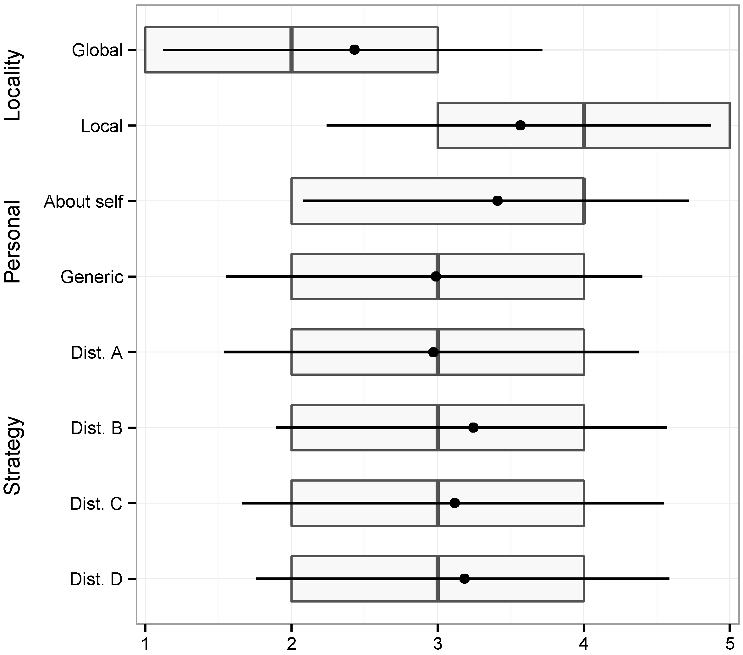 These same results are also depicted in Figure 1, in the form of boxplots for the various variables and levels. The left and right sides of the boxes represent the first and third quartiles, respectively, and the line inside the box represents the median. Given the nature of our data, with discrete values and all the scenarios having the same minimum (1) and the same maximum (5), we decided to overlay information about the mean value (the dot) and one standard deviation below and above the mean.