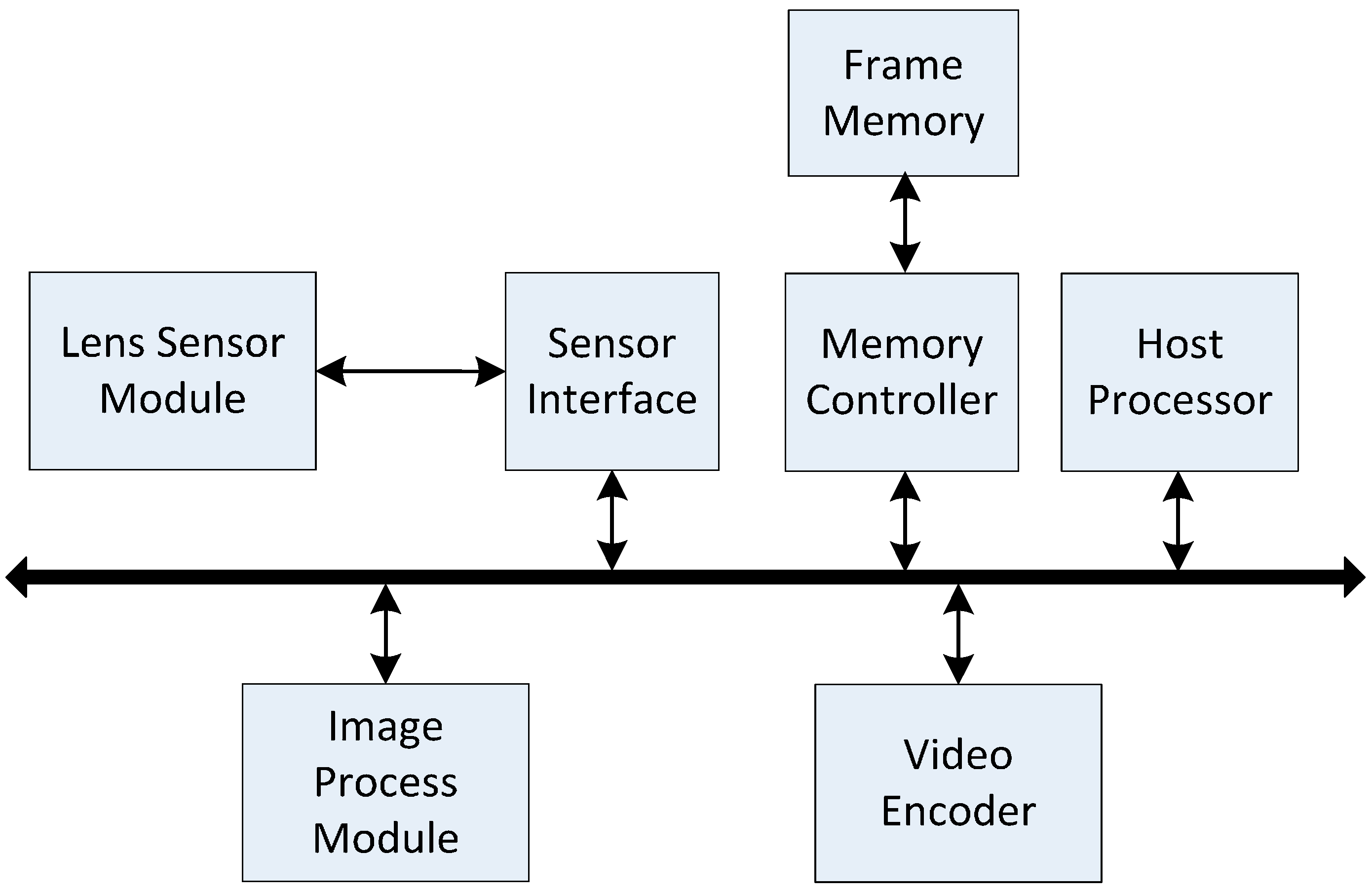 Figure 1 gives the block diagram of a video-acquisition system [2]. The sensor interface obtains pixels from the image sensor (Lens Sensor Module) and continuously transfers them to the external memory (Frame Memory) via the memory controller. The type of the external memory is DDR3 memory with 64-bits bus width, 4GB capacity and 800 MHz memory clock frequency. Once one row of pixel-blocks in an image is ready in the external memory, the image process module processes these pixel-blocks one by one. The output pixel-block can be transferred to a typical video encoder module for video compression. The host processor (e.g., an ARM processor) is used to control or configure the other modules.